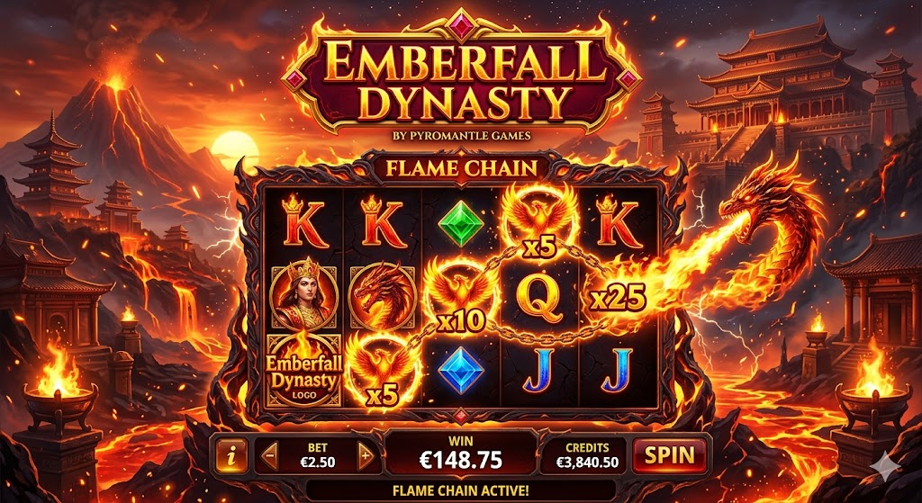 Emberfall Dynasty dari PyroMantle Games berhasil menghadirkan konsep kerajaan api yang tidak hanya menarik secara visual, tetapi juga kuat secara gameplay. Sistem Flame Chain dan Burning Multiplier menciptakan pengalaman bermain yang aktif dan progresif.